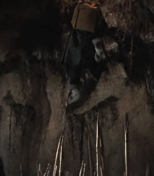 A dropaway floor with a pit of spikes below, set to go off after someone activated it with the copper medallion discovered on Chester Copperpot's corpse. The medallion sets off a small Rube Goldberg-like machine, consisting of an iron ball rolling down a set of tracks. The pit doubles as the way down to go deeper into the caves.