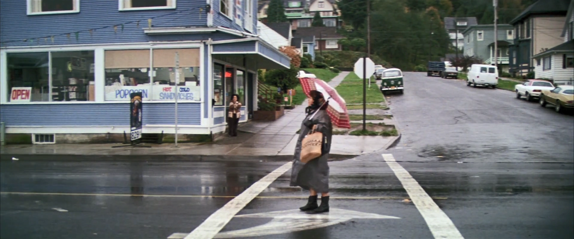 During their car chase with the Astoria police, the Fratellis speed down Leif Erikson Drive, past the Stop 'N Snack and nearly hitting a woman attempting to cross the street.